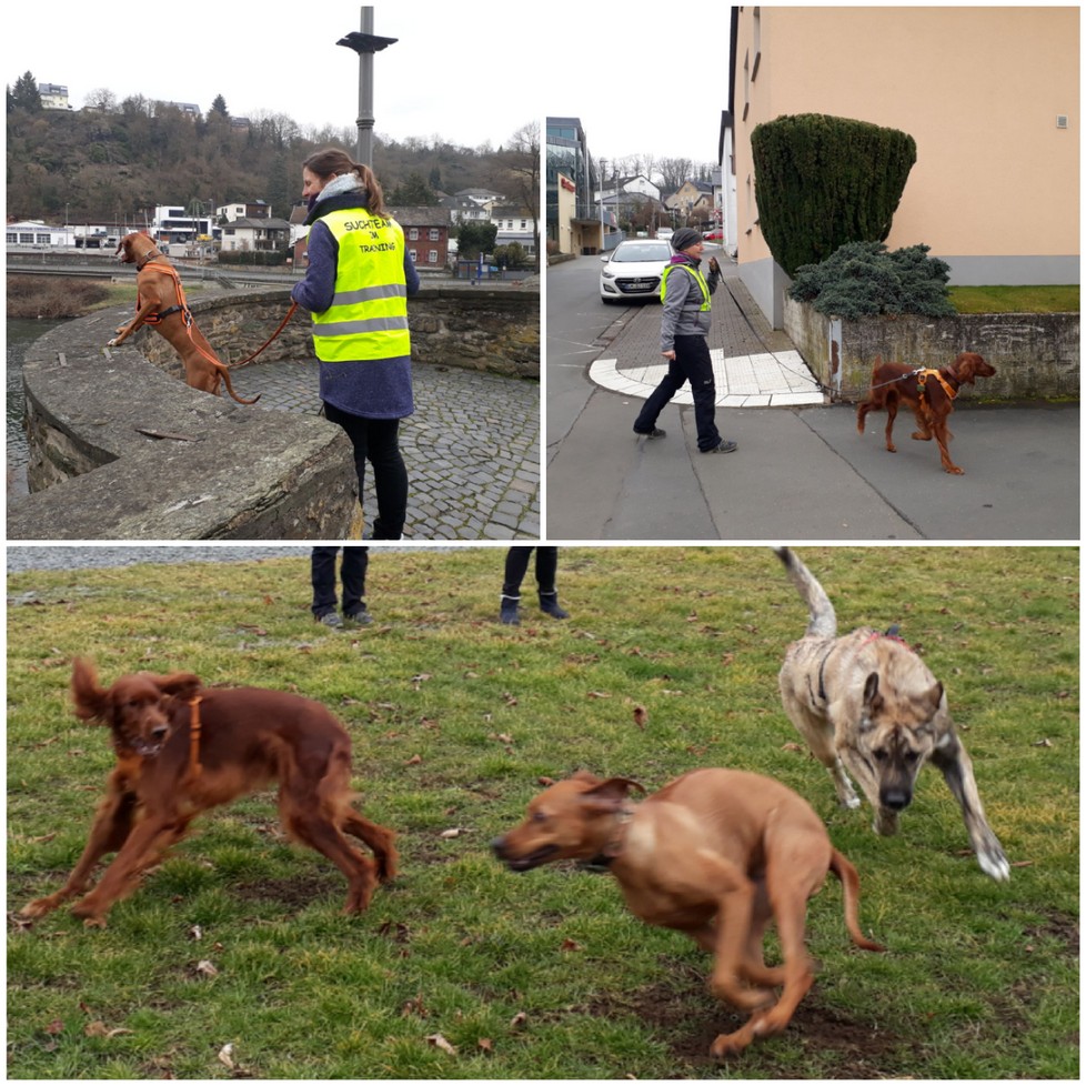 Auch Indira hatte eine schwierige Auffindeposition. Denn Susanne war in Bewegung und dazu kam noch die große Ablenkung durch 2 Hunde, die Gassi geführt wurden.